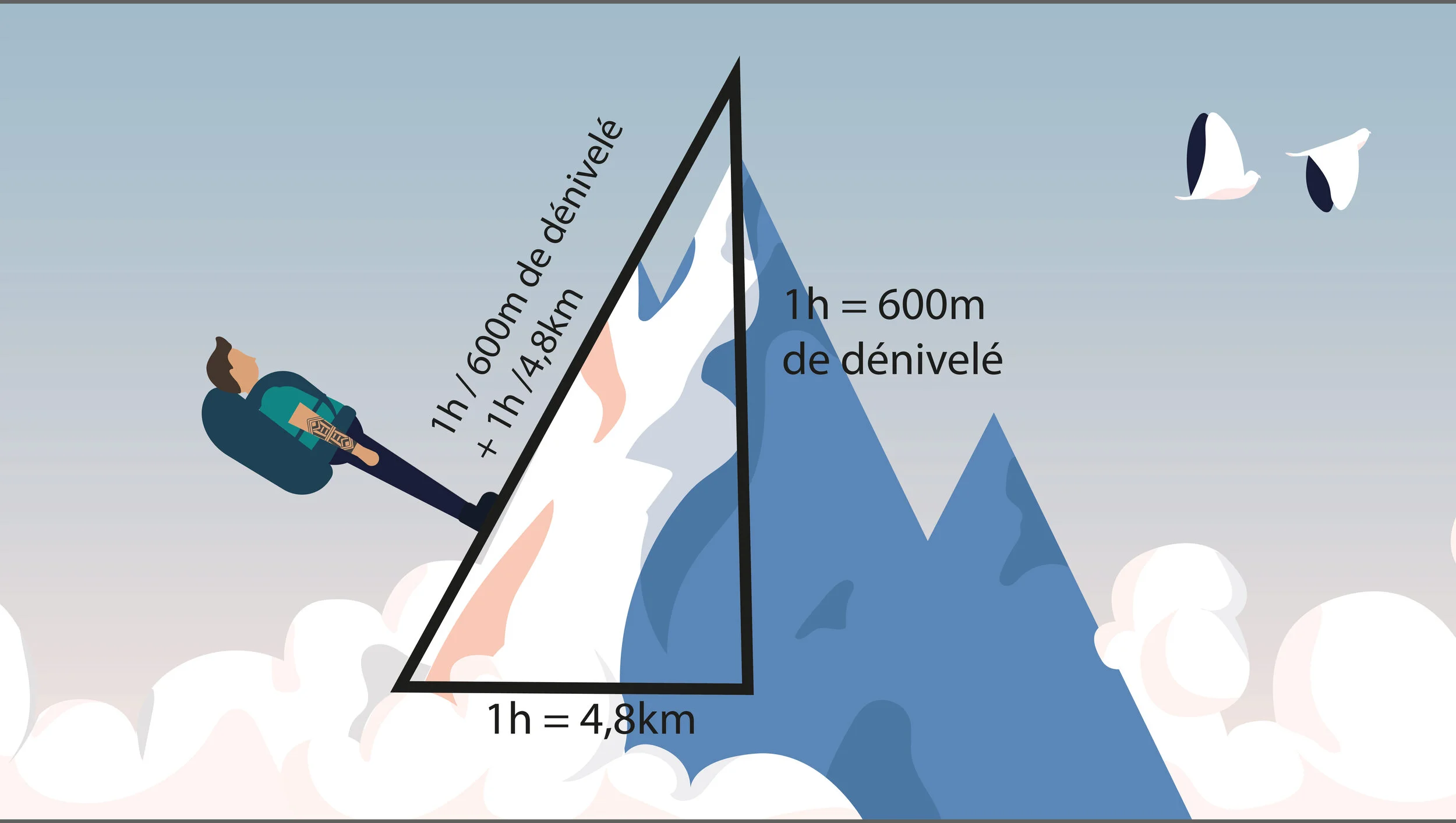 Dénivelé positif : 400m. Si 500m = 60minutes, alors 400m * 60minutes / 500m = 48minutes.