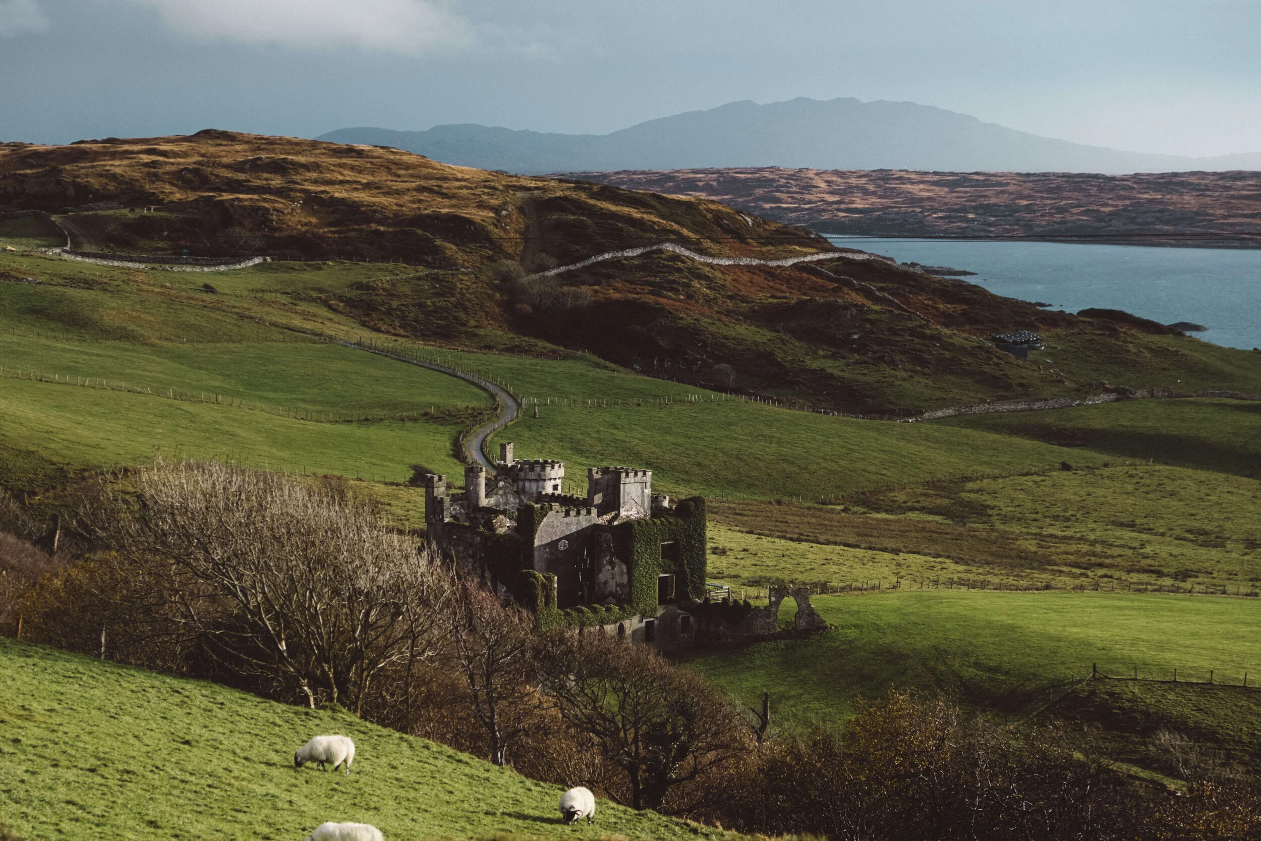 Pourtant, en cette fin de journée (soit environ 15h30, l’Irlande en hiver…), les lumières dorées qui ont réussi à percer à travers les nuages nous offrent un décor magnifique ! Le château se dresse au milieu de ces collines, et donne un aspect mi dramatique, mi romantique au lieu. Enfin, à bien y réfléchir, il semblerait que l’on soit plus du côté dramatique, au vu de l’état de la bâtisse…
